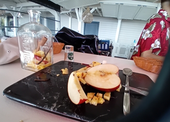 Garden of Eden and rum workshop. Deciding not to do much we drove to the gardens, only a couple of km away. Lots of different flowers, plants and trees (and mosquitos). In the afternoon we went to La Plage restaurant to learm how to make a rum cocktail. We were given lots of ingredients to cut up and put in our bottle, then some sugar syrup and 'agricole' rum. This was then wrapped up for it to fester and take home. Dinner again at the Varangue Restaurant, Julie had Maigret de Canard and Ron a burger.