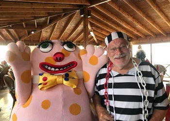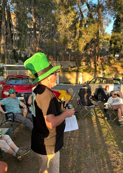 | Saturday 10th After breakfast we gathered for the run/walk. There were only 4 runners (though Julie only did a bit of it), about 10 long walkers and the rest took a shorter route. Very hot and the drinks stop was most welcome. The circle afterwards was a cramped affair as everyone was trying to find some shade. Ray (Zebedee) did a good job as RA. In the evening everyone turned out in fancy dress, the theme: heroes and villains. |